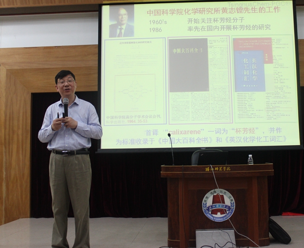 王胜院长向全体师生简要地介绍了王梅祥教授的科研成果,当听到王教授取得如此卓越的成就时,在座的学生都钦佩不已。王梅祥教授通过讲述佩德森、莱恩、克来等人的故事,教诲在座学生应该注重培养自己的兴趣和好奇心,拓宽视野,做一个有信仰的人。同时他还介绍了超分子研究的发展,深入浅出地为大家讲解超分子的相关合成实验,展示了有关新型功能化大环分子的超分子化学研究成果。
