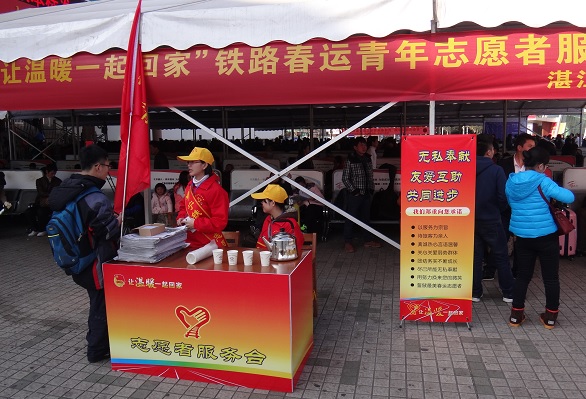 据悉,我校团委、青年志愿者联合会严格按照共青团中央和铁道部关于开展招募社会青年志愿者参与2014年铁路春运活动的工作部署,招募我校40名志愿者在湛江火车站开展了为期28天的“情暖回乡路”青年志愿者参与铁路春运志愿服务活动。在服务岗位以彬彬有礼的态度,一流的服务意识,圆满完成了铁路春运志愿服务工作,赢得广大旅客的肯定和支持!