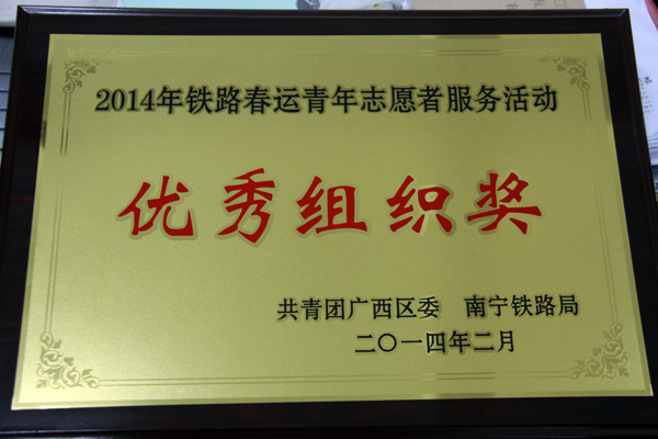 近日,共青团广西区委,南宁铁路局宣布关于表彰2014年铁路春运青年志愿者服务活动先进集体服务明星志愿者和优秀志愿者的决定。我校喜获2014年铁路春运青年志愿者服务活动的“优秀组织奖”,我校文志豪等2名同学获得“服务明星志愿者”称号,陈创希等10名同学获得“优秀志愿者”称号。
