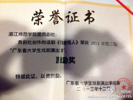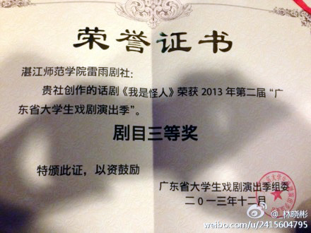 1月4日下午,第二届广东省大学生戏剧季颁奖典礼在竹丝岗小剧场举行。我校雷雨话剧社再创佳绩,其剧目《我是怪人》获剧目三等奖和激励奖。
