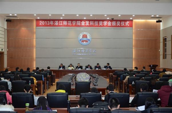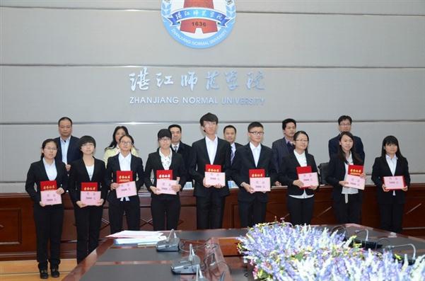 大会伊始,校友办刘坤章主任宣读表彰决定。在主席台上就坐的领导为获得湛江师范学院“金发科技奖学金”的31名品学兼优学子颁发了荣誉证书和奖金。