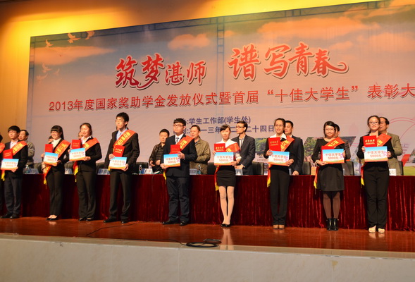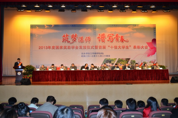 12月24日晚,我校2013年度国家奖助学金发放仪式暨首届“十佳大学生”表彰大会在音乐厅隆重举行,学校党委黄钢副书记、学生工作指导委员会成员、学生处全体干部、全体辅导员,自强社学生干部和学生代表出席了大会。大会由学生处陈永国副处长主持。