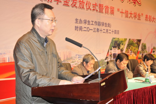 大会伊始,首先由学生处李粤处长作2013年度国家奖助学金评审和“十佳大学生”评选工作总结。