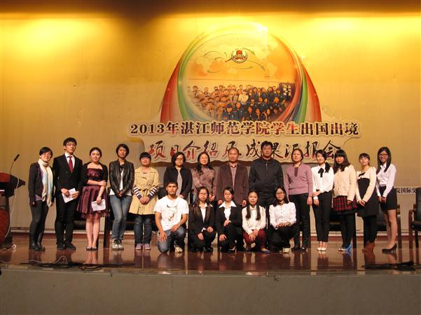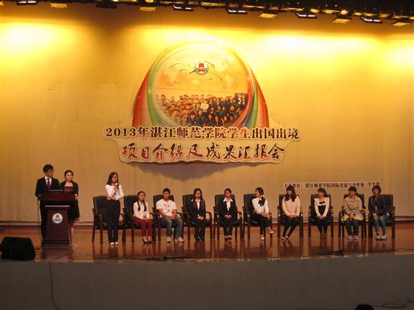 12月11日晚,2013年湛师学生出国出境项目介绍及成果汇报会在音乐厅举行,国际交流与合作处邓逢光处长、郑志军副处长、肖建春副处长、学生处冯淩淩科长及各二级学院的辅导员代表出席了本次汇报会。