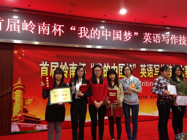 12月7日,首届岭南杯“我的中国梦”英文写作技能大赛在广州航海学院举办。我校派出1名英语专业组选手和3名公共英语组选手参加比赛。经过激烈竞争,我校外国语学院罗金玲同学获专业英语本科组一等奖,法政学院温雪仪同学获公共英语本科组一等奖,同时获得了“优秀团队奖”称号。