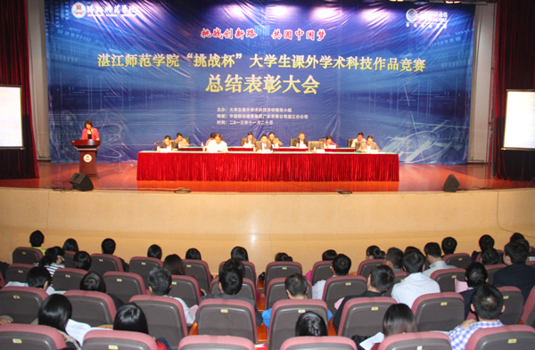 为总结经验,表彰先进,推动我校学生科技创新工作深入开展,11月20日晚,我校在音乐厅隆重举行“挑战创新路,共圆中国梦”湛江师范学院2013年“挑战杯”大学生课外学术科技作品竞赛总结表彰大会。