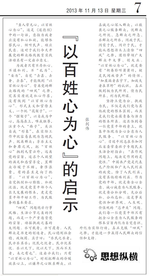 11月13日出版的《人民日报》理论版刊登了我校继续教育学院院长张剑伟教授关于党的群众路线教育实践活动的理论文章。该文章的标题是《“以百姓心为心”的启示》。张教授以《道德经》的“圣人常无心,以百姓心为心”所指的“为政者应没有私心私欲,能够体察民心、倾听民声、顺应民意。”开篇,指出“以百姓心为心”在党的群众路线教育实践活动中具有现实的启示意义。