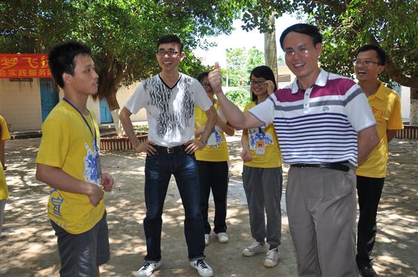 7月13日,校党委书记梁英与广东省高等教育出版社董事长吴惟粤、社长兼总编辑杨哲、办公室主任龙文清、校党委办公室主任黄达海、党委宣传部部长陈恕平一同到“幸福红领巾”社会实践队实践点雷州乌石镇三教小学,观看了社会实践队组织的活动。活动结束后,梁英书记一行又与社会实践队队员座谈,深入了解队员的工作、生活情况,对社会实践队活动的策划与组织进行了指导。座谈会上,梁英书记指出学校会为同学们的实践成长提供强力后盾,勉励“幸福红领巾”社会实践队要出色完成各项任务,做出成效,从全国50强的重点团队突入30强,激励了社会实践队全体队员以踏实的奉献和创新的激情逐梦前行。