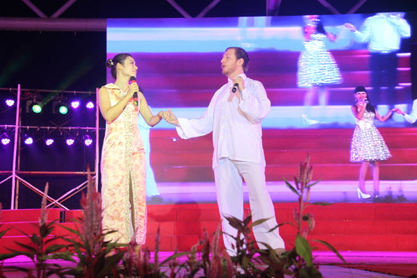 校友刘坪、吴怡等人用嘹亮欢快的歌声演唱了一曲《半岛 绿色的梦》又一次把晚会推向高潮。而最有趣的是本场晚会新增安排由外教、留学生等演唱改编过的《湛师欢迎你》,表演者们踏着绚丽的舞步,身上穿着各自国家特色服装,新鲜的编排实在令人眼前一亮。晚会现场群情激昂,掌声雷动。