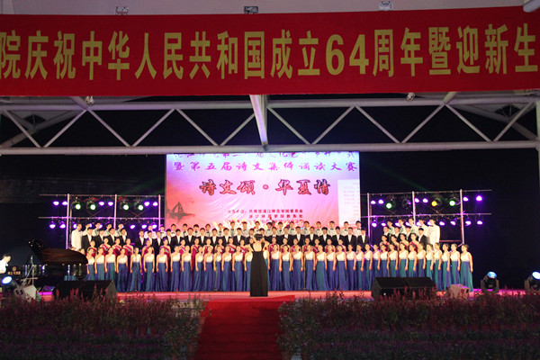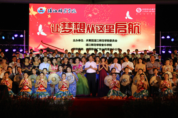雷阳之夜,点燃湛师金秋激情;载歌载舞,飞扬学子青春梦想。由校团委和音乐学院主办的,以“让梦想从这里起航”为主题、庆祝中华人民共和国成立64周年暨迎新生文艺晚会于9月27日晚在雷阳广场精彩上演,师生们用一首首荡气回肠的赞歌颂扬伟大祖国的繁荣昌盛,用一支支充满激情的舞蹈展示湛师学子们脚踏实地、奋发向上精神品质。。