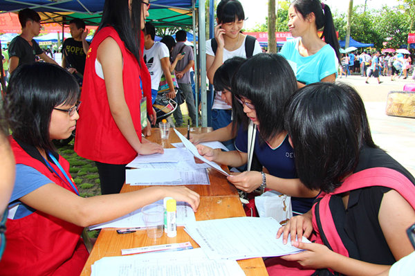 在学生处勤工中心设立的新生资助政策咨询点和勤工助学岗位申办点,吸引了不少贫困新生和家长前来咨询。校自强社的学生干部们热情地为每一位新生和家长介绍我校学生资助政策,解答各种有关资助的问题,并结合自身的经验给予新生们很多实用的建议。现场一位来自北方甘肃的女生告诉我们:“今年家乡遭遇了旱灾,地里颗粒无收,我家损失很大,现在只带了一千多块钱,不知道能不能先入学。”她在学生干部们的指引下,先来到绿色通道办理了缓交学费手续,并填写了勤工助学岗位申请表,入学后将予以优先安排上岗。