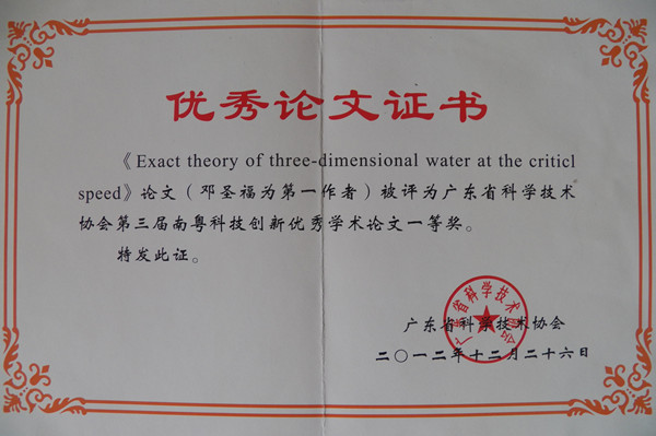 近期,广东省科学技术协会公布了第三届南粤科技创新优秀学术论文评选活动结果,我校数计学院校聘教授、留美博士后邓圣福老师的论文《Exact theory of three-dimensional water at the criticl speed》获得一等奖。