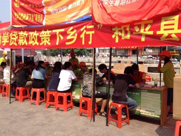 作为连续两年入选省教育厅“助学贷款政策下乡行”的试点高校,我校高度重视,精心策划,制定了2013年“助学贷款政策下乡行”工作方案,在7月初启动了2013年暑假国家助学贷款政策下乡行活动,组织了6支队伍分赴粤西、粤北基层农村进行宣传走访活动,其中一支在学生处李爱群正处级干部和学贷中心巫智慧老师的带领下,由在全校范围内招募的志愿者、学贷中心学生助理组成,远赴河源市和平县进行国家助学贷款政策宣传活动。