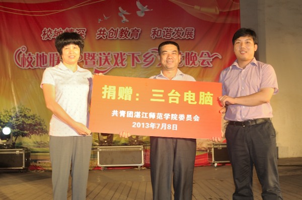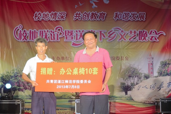 晚会伊始,我校党委刘海涛副书记代表我校向乌石镇一村委捐赠了电脑三套,教务处程可拉处长代表我校向乌石镇乌石中学捐赠课桌椅十套以及图书等物质。乌石镇镇委副书记谭超镇长(主持全面工作)致欢迎词,谭镇长在致欢迎词中表达了对我校领导老师和学子们到来的感激之情,认为校地合作能促进双方互利共赢,并希望我校和乌石镇能加强交流,加深合作,推动校地合作工作长期有效开展。本次晚会由我校团委以及乌石镇镇委、镇政府为观众们献上了一场视觉的饕餮盛宴。