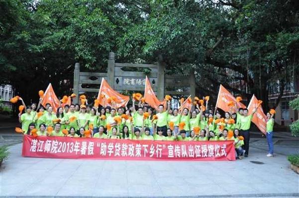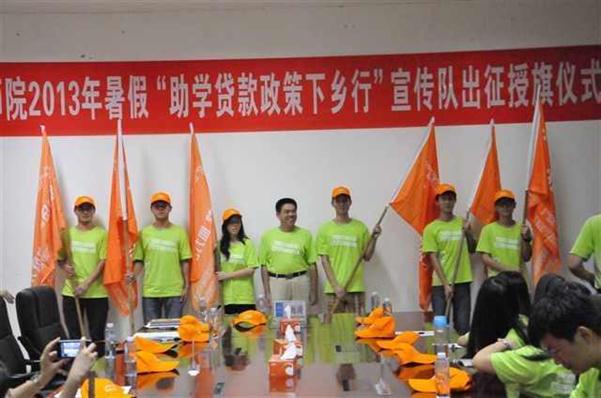 7月5日下午,我校在三号会议室召开2013年暑假“助学贷款政策下乡行”宣传队出征授旗仪式。出席仪式的有学校党委刘海涛副书记、学生处长李粤处长、李爱群正处级干部、学贷中心老师和全体学生助理、各宣传队指导老师以及全体成员出席仪式,仪式由巫智慧老师主持。