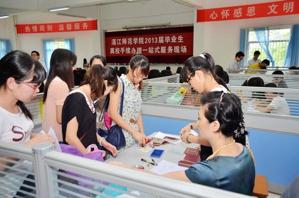 6月17日,教三111室毕业生们络绎不绝,师生们愉快地忙碌着,我校2013届毕业生的离校手续办理一站式服务工作正在有条不紊地进行。学校党委刘海涛副书记、学生处李粤处长、财务处吴华明处长、学生处正处级干部李爱群、财务处梁伟民副处长亲临“一站式服务”现场指导工作。李粤处长向刘副书记介绍了“一站式服务”具体开展情况,刘副书记也到每一个办理点了解离校手续的办理情况,并同在场办理手续的毕业生进行亲切的交谈。