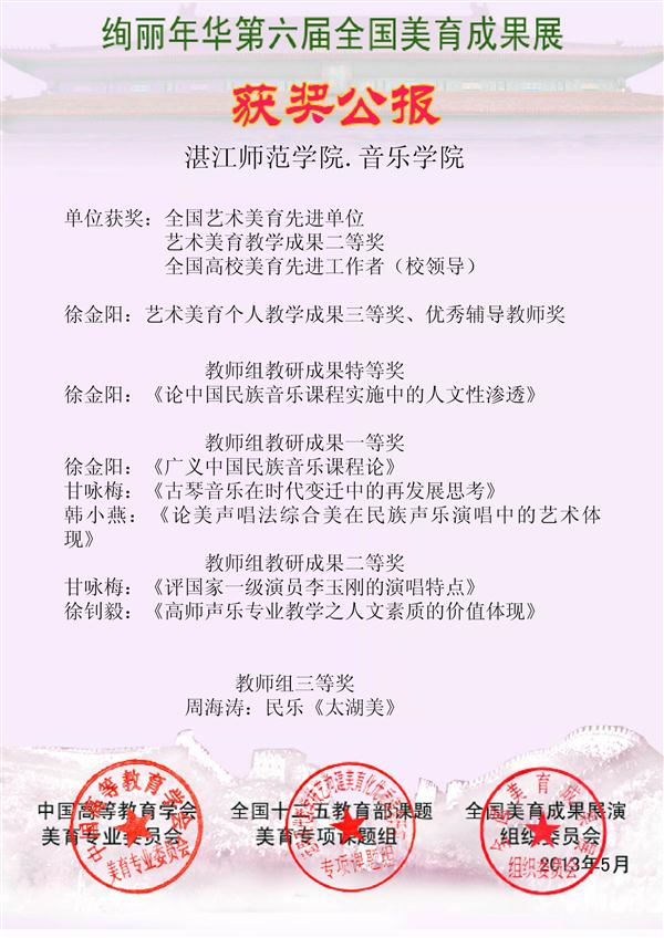 在本次活动在孙建华院长的关心与大力支持下,由徐金阳副院长负责组织。活动中湛江师范学院音乐学院获得了全国艺术美誉先进单位奖、艺术美育教学成果二等奖、全国高校美育先进工作者(校领导)徐金阳老师获得了艺术个人教学成果三等奖、优秀辅导教师奖,还有老师的科研论文《论中国民族音乐课程实施中的人文性渗透》和《广义中国名族音乐课程论》分别在教师组科研获得特等奖和一等奖。甘咏梅老师的论文《古琴音乐在时代变迁中的在发展思考》和《评国家一级演员李玉刚的演唱特点》分别获得教师组科研一等奖和二等奖。此外在同组比赛中韩小燕老师的论文《论美声唱法综合美在民族声乐演唱中的艺术体现》获得了一等奖、徐钊毅老师的论文《高师声乐专业教学之人文素质的价值体现》还有由周海涛老师的组织民乐合奏《太湖美》获得三等奖。