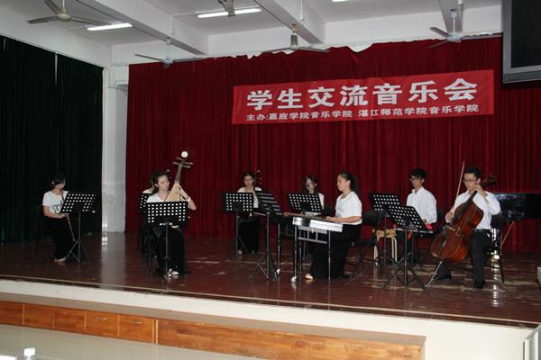 为推动和促进两学院的教学改革与人才培养工作,我校音乐学院对本次活动进行了精心的安排。在交流活动中,我校音乐学院除安排了教师座谈交流会外,更为嘉应学院的师生提供了民乐、合唱、管乐等乐队以及钢琴、声乐、舞蹈的排练或教学观摩。当天晚上,在艺术楼音乐表演室两院学生联合举行学生交流音乐会。我校刘周堂副校长、嘉应学院音乐学院吴华山院长、李君副院长等所有来访师生,音乐学院党政领导班子和各系部主任等出席了晚会。