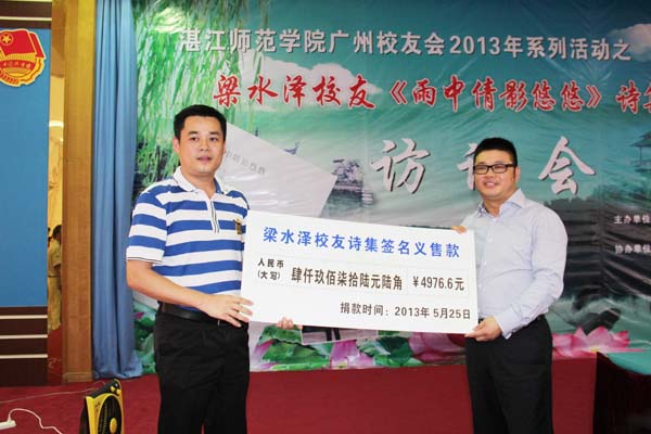 梁水泽校友诗集《雨中倩影悠悠》写到:“因为那里有我的过去,我的故事;有我的呐喊,我的理想……所有的一切,都是我成长的印记。生命需要感动,这些便是我感动的原料。”在随后进行的签名售书活动中,在座学子纷纷上台与梁水泽校友交流互动并购书;梁水泽校友将所得售书款4976.6元当场捐给了学校“爱心驿站”负责人。