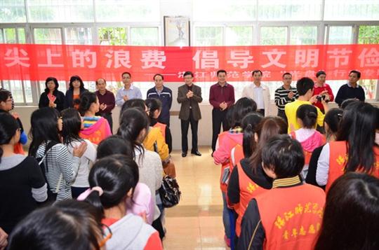 湛师新闻网4月8日讯 为积极响应习近平总书记“厉行勤俭节约、反对铺张浪费”的倡议,创建节约型校园,4月2日中午,我校在鸿园一楼隆重举行了主题为“杜绝舌尖上的浪费,倡导文明节俭新风”的“光盘行动”系列活动启动仪式,活动由校学生会主席梁仍扬同学主持。