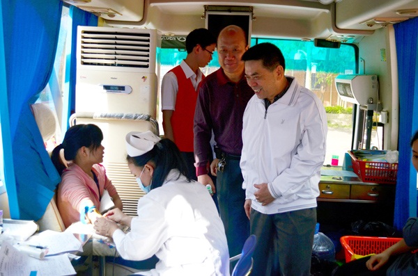 在会场四周,众多爱心系列活动引人注目,同学们积极参与,现场气氛非常活跃。刘海涛副书记和市中心血站罗均站长在校团委郭和才书记的陪同下参观了活动现场。在无偿献血现场,一批批义务献血的同学们有序地进行填表登记、体检等,现场秩序井然,气氛活跃。领导们亲切慰问了参加献血的同学和忙碌服务的志愿者们,并对大家的工作给与了充分的肯定和赞扬。刘海涛副书记认为,献血是一件颇具意义的事情,一方面,无偿献血是当代大学生应尽的义务,体现的是助人为乐,团结友爱、关爱社会的精神,是对人生意义的一次丰富和升华。团委郭和才书记则认为,我校志愿者们具有优良的传统作风和高度的奉献精神,相信我校的志愿服务事业在社会各界的关心和志愿者们的努力下,定会再上新台阶。