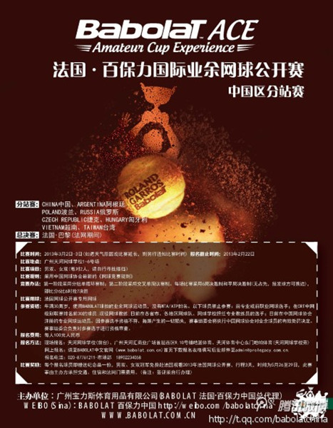 据悉,这次法国·百保力国际业余网球公开赛是国际性业余赛事,分站赛包括有中国、阿根廷、波兰、俄罗斯、匈牙利等赛区,总决赛于5月底与法国网球公开赛同时举行。