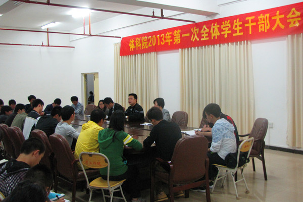 湛师新闻网2月28日讯 为迎接新学期的到来,在一切工作开始之前为体育学子们加足油、鼓足劲,并对新学期的工作进行部署安排,体科院于昨晚在体育馆会议室举行了2013年第一次全体学生干部大会。体科院党委郑晓辉副书记,辅导员刘天明老师、莫毅老师、陈静老师及体科院全体学生干部参加了此次会议。会议由刘天明老师主持。