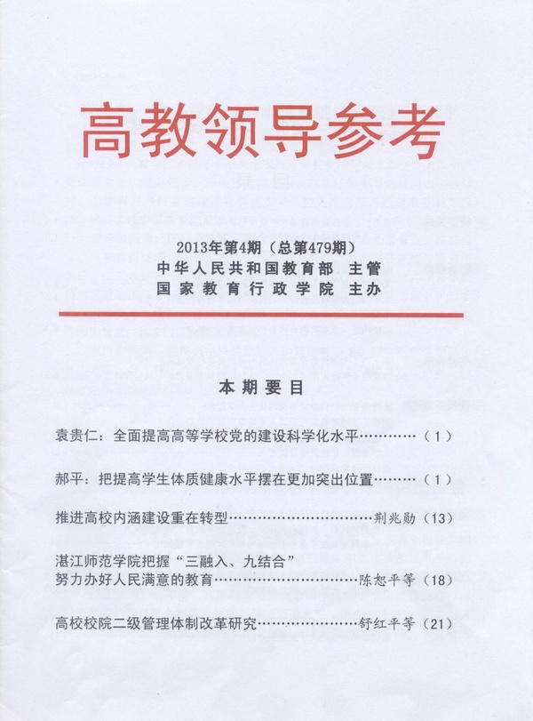 湛师新闻网2月26日讯 由教育部主管、国家教育行政学院主办的《高教领导参考》2013年第4期发表《湛江师范学院把握“三融入、九结合”努力办好人民满意的教育》一文,并列上“本期要目”。这是2009年以来我校发表在《高教领导参考》的第七篇经验。
