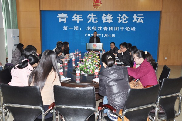 湛师新闻网1月8日讯 为深入落实党的十八大精神,扎实开展学习型、创新型、服务型团组织建设,为团干部搭建一个良好的沟通交流平台,以改革创新的精神推动学校团学工作内涵式发展,1月4日,我校在鸿园418室举行了第一期青年先锋论坛,论坛主题为共青团团干论坛。校团委全体领导老师,各二级学院团委负责人及部分学生干部参加了本次论坛。论坛由团委郭和才书记主持。