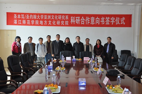我校地方文化研究院各研究所的所长也在座谈中介绍了本所的研究概况。广州湾研究所景东升所长指出,湛江的广州湾历史研究在学术上还基本处在空白阶段,学术价值很高,但法国殖民统治和日本占领时期的有关史料缺失,希望通过与圣本笃/圣约翰大学的合作,在美国获得部分相关档案与研究资料,促进工作的有序开展。南方诗歌研究所张德明所长介绍了他们取得的成绩,包括在广东新时期诗歌研究、当代优秀诗人个案研究和湛江当代诗歌研究等方面取得的科研成果,及开展湛江海洋诗歌节、文化进校园活动的成绩、想法及成果共享情况。雷州体育文化研究所温博所长、雷州民间艺术研究所孙建华所长及粤西宗教研究所于卫青所长都对各自研究所的人员队伍、研究方向及研究上遇到的困难进行了介绍与交流,侨民商道研究所宋长琨所长、雷州美术研究所的彭飞老师及吴川文化研究所陈东英所长等也介绍了各所成立的背景及发展蓝图。陈东英教授指出,我校地方研究院涉及研究领域广泛,同圣本笃/圣约翰大学合作可以促进中国文化走出去,并增强双方的科研实力。