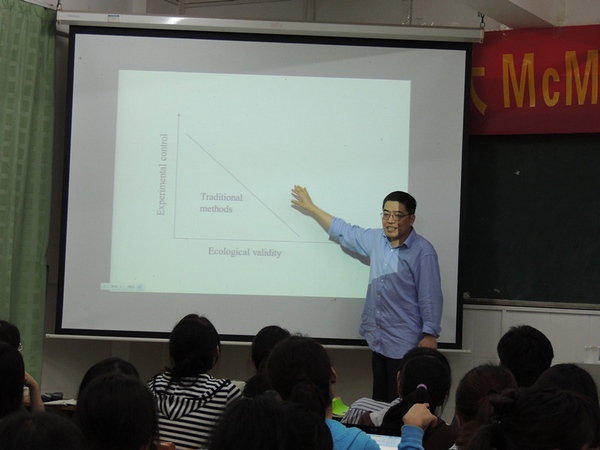 讲座上,孙教授通过大量生动有趣的实验讲述了虚拟现实和空间的感觉与认知的概念。孙教授认为空间感觉的特点是交互和立体视觉,而他研究的主题是交互行为和空间记忆,即必须有两个交互的视觉信息,使人在虚拟的现实感到身临其境,或者是触摸反馈。同时,孙教授强调了理论基根于实验的重要性,阐述了实验所要注意的问题。孙教授在讲座上提出了大学生在大学必须学会的两个能力,一个是批判能力,另一个是表达能力。大学生要学会运用辩证思维去看待事物,思考问题。在学会用批判眼光观察事物的同时,也要锻炼自我的语言表达能力,没有灵活的语言,再智慧的思想也只能胎死腹中。孙弘进教授的精彩演讲,让在座师生受益匪浅,特别是对心理系学生有了新的指导和启迪。在互动环节,师生踊跃提问,孙教授热情回答,本次讲座不仅分享了关于虚拟现实和空间感觉与认知的知识,还交流了中外文化之间的差异和学生申请留学的一些技巧和应该具备的能力。