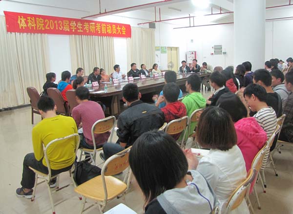 湛师新闻网12月17日讯 12月15日晚,体育科学学院在院会议室举行了2013届学生考研考前动员大会,会议由体科院党委郑晓辉副书记主持。体科院副院长温搏博士、体育教育系主任孙卫红博士、社会体育系主任孙忠利博士、社会体育系副主任李鲁老师、体科院科研秘书长张华老师以及辅导员陈静老师出席了本次大会,体科院即将参加2013年全国硕士研究生入学统一考试的42名同学无一缺席。华南师范大学体育科学学院6名在读硕士研究生作为特邀嘉宾出席了会议。