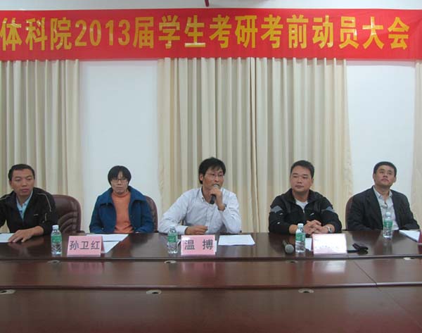 大会伊始,温搏副院长作动员讲话。他从体科院历年的考研成果和自己辅导学生的亲身经历两个方面总结了近年来我院考研工作。他指出坚持是成功的基石,希望同学们冲破种种困难,明确自己的目标,坚持自己的考研之路,要有“生当作人杰”的凌云壮志,勉励同学们放下思想包袱,轻装上阵,共同努力开创我院考研工作的新局面。
