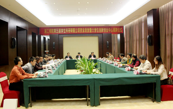 湛师新闻网12月14日讯 打造科研品牌,创新培养人才。为繁荣校园学术创新,促进人才培养,筹备将于明年3月举行的第十二届“挑战杯”广东大学生课外学术科技作品竞赛,12月7日下午,我校第五届学生科研课题立项资金发放暨大学生创新创业中心揭牌仪式在樟树湾大酒店隆重举行。学校李江凌副院长,学生课外学术科技活动专家评审委员会成员参加了会议,会议由校团委郭和才书记主持。