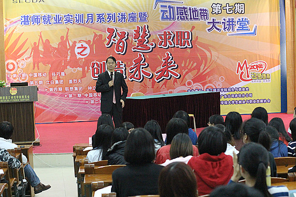 湛师新闻网12月10日讯 昨晚,为了提高我校学生的面试能力,使之更好实现就业梦想,由我校招生与就业处和中国移动广东公司赤坎分公司主办、我校大学生就业与职业发展协会承办的就业实训月系列讲座暨动感地带第七期大讲堂之“智慧求职,创造未来”于弘雷楼311教室举行。此次讲座由中国移动广东公司赤坎分公司总经理林华扬先生主讲,校招生与就业处指导科科长张彦老师出席了讲座。