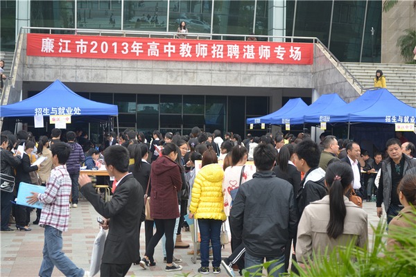 湛师新闻网12月7日讯 6日,廉江市2013年高中教师专场招聘会在我校体育馆前举行。参加此次招聘会的学校有廉江中学、廉江一中、二中、五中等11所学校,招聘岗位多达139个,涉及学科包括中英数、舞蹈、心理学等。