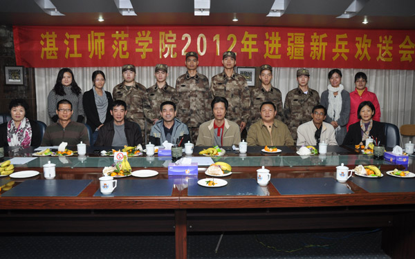 湛师新闻网11月28日讯 好男儿志在四方,热血激扬效祖国。为送别我校即将奔赴新疆参军的学生,昨日下午,我校在行政楼一号会议室召开了“2012年进疆新兵欢送会”。学校党委刘海涛副书记,党委武装部林森部长、李海文副部长、郑赞芳副部长,教务处谭荣波副处长、学生处谢巧云副处长以及六位新兵所在的二级学院领导、辅导员出席了本次欢送会。欢送会由党委武装部林森部长主持。