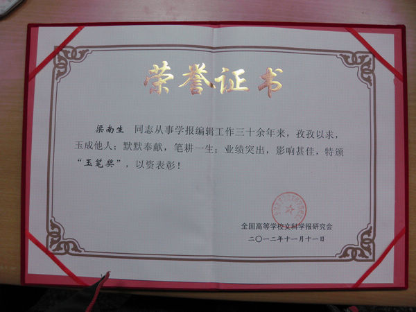 湛师新闻网11月26日讯 全国高等学校文科学报研究会第七届会员代表大会于十一月十日至十四日在河南省郑州市举行。我院学报编辑部办公室主任梁南生荣获全国高校文科学报研究会首届“玉笔奖”,并得到大会颁发“玉笔奖杯”和荣誉证书。“玉笔奖”为全国高校文科学报研究会自上世纪八十年代创会以来第一次设的奖项,全国共评30名,广东省只有一名。