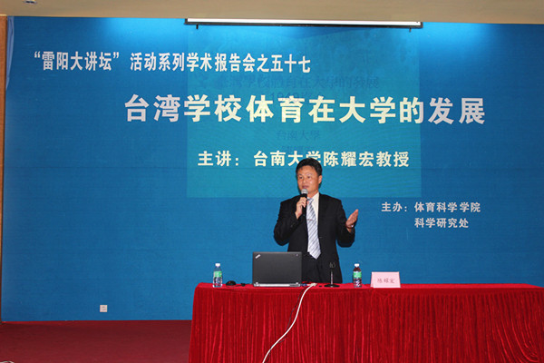 当天下午,陈耀宏教授在弘雷楼311室为体科院师生作 “台湾学校体育在大学发展”的专题报告会,陈教授结合当前台湾高校体育院系的实际,从大学体育的课程、大学体育学系两个方面,具体介绍了台湾学校体育在大学的发展情况,并从时政、经济、文化等方面分析了影响台湾学校体育成长史。陈教授在报告中指出,未来的学校体育应以培养学生终身体育意识、习惯和能力作为根本目标,继而探索多样化、特色化的学校体育组织形式,处理好学校体育与竞技运动的关系,重视“竞技运动教材化”的研究与应用。互动环节中,陈教授针对师生提出的问题进行了详细地解答。报告会现场气氛活跃,师生受益匪浅,不仅使同学们对学校体育有了更深刻的认识,也进一步了解了海峡两岸的体育文化的差异性与多元性,更加明确了自己专业学习的目标。