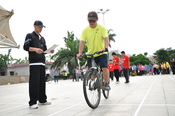 据了解,自行车慢骑胜利的原则是在30米长1米宽的直道内,骑自行车时间最长的参赛选手为优胜者,期间双脚不可以触碰地面,否则出局。各参赛选手都使出自己九牛二虎的耐力,以延长到达终点的时间。