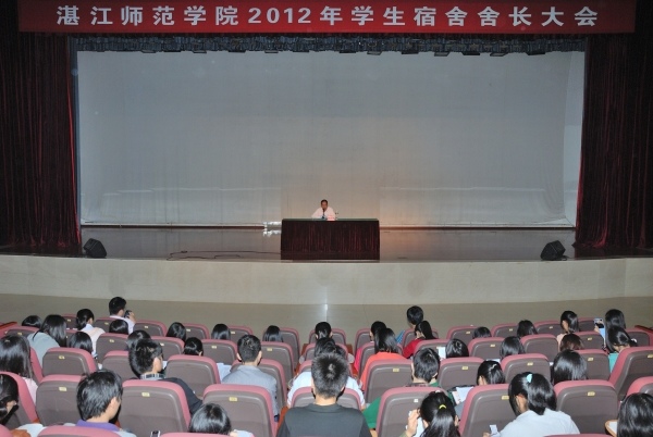 湛师新闻网11月14日讯 11月11日,我校2012年学生宿舍舍长大会在音乐厅召开,这是我校首次召开全校学生宿舍舍长大会。学生处陈永国副处长、校团委李亚九副书记,公寓管理中心陈奕鹏主任、张瑞萍副主任,校团委梁剑老师以及一年级至三年级全体舍长参加了大会,会议由校学生会指导老师梁剑主持。
