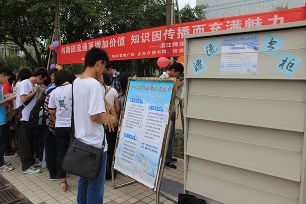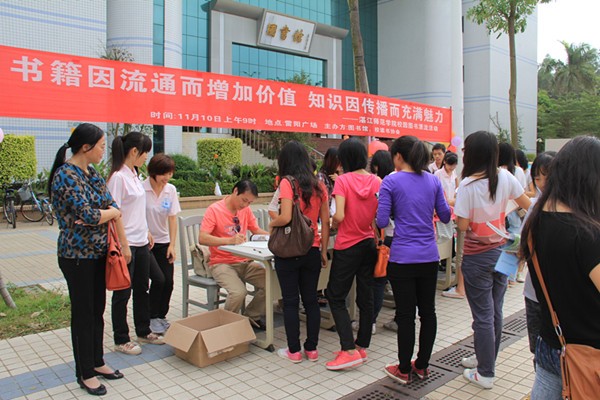 湛师新闻网11月14日讯 近日,图书馆和读书协会在雷阳广场联合举办了首届图书漂流活动。本次活动主题为“书籍因流通而增加价值,知识因传播而充满魅力”,目的是鼓励师生读者阅读更多更好的书,并提供一个读书心得的交流平台。图书馆陈俊群馆长、《粤西越美》主编冼汉文先生以及图书馆信息服务部的老师出席了本次活动。