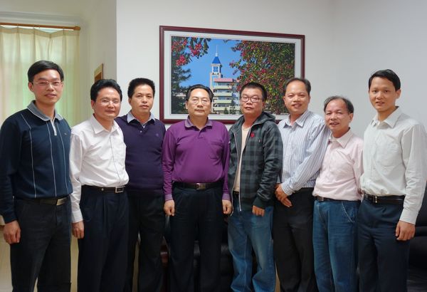 华南师大校友办主任、基金办主任仲铭锦(左三)与有关领导接待会见了考察团一行
