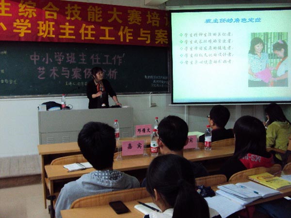 湛师新闻网11月12日讯 为提高广大师范生的综合技能,培养一代代具有竞争力的人民教师,教科院与我校师教协会11日晚于燕雷楼501室共同开展了一场以“中小学班主任工作的艺术与案例分析”为主题的技能培训讲座。教科院白彦茹教授担任此次讲座主讲老师,该院辅导员邓倩文参加了此次讲座。