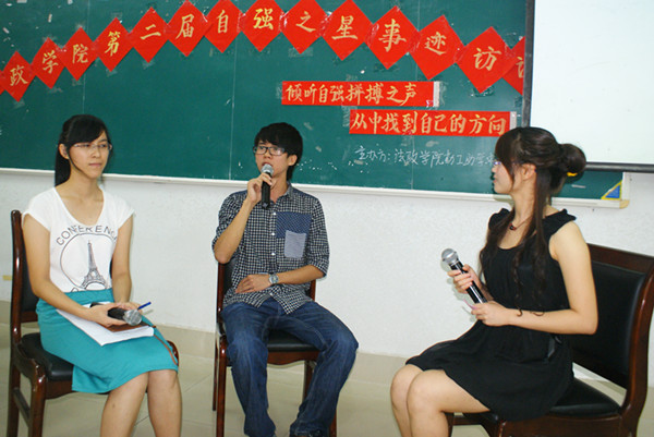 访谈会伊始, 10法本王韬全以PPT形式展示自己的大学经历,并鼓励在座的师弟师妹通过自己的努力改写人生,成就未来。大学三年他曾担任10法本班班长、法政学院学生会副主席、12法本助班,在此过程中,他学会了从不同的角色中找到自己努力的方向,自强拼搏,他用一句话总结了这一历程,“生命不息,奋斗不止。”随后,校“自强之星”叶敏华以讲故事的方式讲述自己的经历和心路历程,在求学路、兼职路上,亲情的力量始终伴随着她成长。她解读了对自强的认识,对学习的执着,对未来的期许。