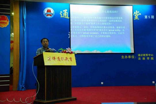 昨晚,通识教育中心和法政学院在教三311教室联合举办了通识教育大讲堂第五期教育前沿系列之《过程哲学及其方法论》讲座。讲座由来自北京第二外国语学院的杨富斌教授主讲。北京第二外国语学院法政学院杨帅博士、陈伟功博士、湛江师范学院宣传部陈恕平部长、通识教育中心林春主任、汤潇林副主任和法政学院科院的部分老师出席了讲座。讲座由法政学院院长袁铎教授主持。