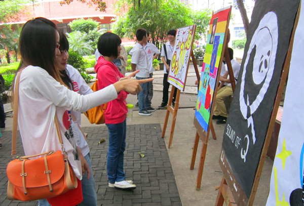 本次海报设计大赛的设计主题是“声音”,独特新颖的主题吸引该院学子的踊跃参与,其中晋级复赛的有来自10、11、12级学生的20份作品,作品展示了选手们对声音的理解,有聆听大自然最原始的声音,有聆听人类、动物内心的呼喊等等,其中,来自11工业设计的邱奋燚同学用新颖的手笔描绘了大自然的呐喊声,他解说道,“本来是鸟语花香的大树现在只能借助喇叭来发出呻吟,这样的环境状况确实需要我们人类反思,我们是时候还给鸟儿一个归宿,让大自然发出属于它的声音。”此外,来自12地理2班的李怡华同学结合当前的钓鱼岛事件,用俏皮的方式发出中国人的保钓之声,深得观众的喜爱。