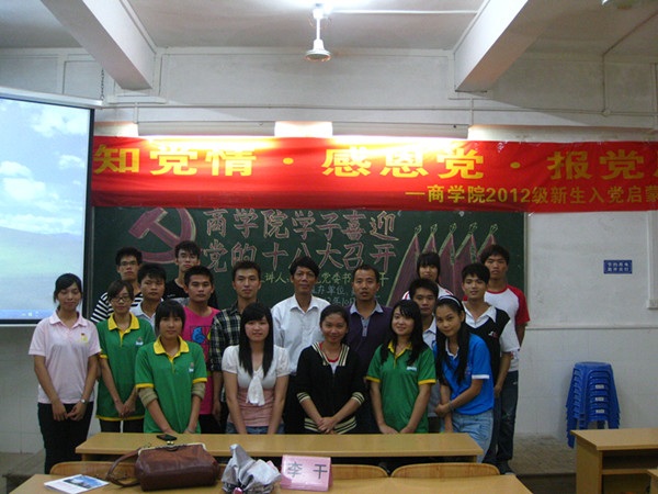 随后,商学院党建办组织部部长黄晓珊向2012级新生们介绍了该学院发展党员的具体流程及基本条件,并鼓励大家要不断提高自身知识和能力,争取早日成为一名合格的共产党员。