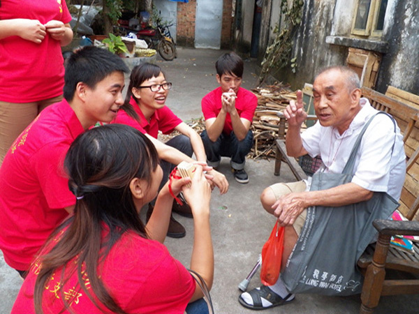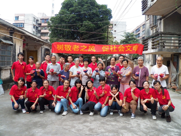 下午4点左右,该党支部成员来到甘机厂。遥远的路途并没有浇灭学生党员们传达爱心的热情,而甘机厂门口一大批老人殷切等候的目光更加坚定了他们心中的那份爱的信仰。他们看到老人们就立刻上前嘘寒问暖,老人们笑眯眯看着他们,嘴里不停地说:“你们这批大学生真的是很有活力,年轻的孩子就是不一样。”温馨的氛围里,支部成员认真听着老爷爷那些年在印尼的故事,遐想着老人年轻时的飒爽英姿;或学学老奶奶编织菜篮子,看看婆婆们打打牌。在与老人的交流中得知,老人大多数是空巢老人,平时这个时候老人们都得回家煮饭,而今天这个特殊的日子,他们却把晚餐推迟了,只为了可以与同学们一起谈心,看他们表演节目。学生党员们听到这,眼里流露出了心疼和欣悦的神色。虽然他们表演的节目不多,但他们卖力的表演得到了老人们的赞赏,尤其是别有新意的快板表演,简短的经典歌曲《南泥湾》。精彩的节目,让原本宁静的小区一下子热闹起来了。
