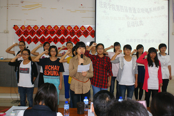 全体教员秉着认真负责的态度进行了宣誓。12级全体学生在班旗的挥舞下,喊出了各班学习普通话的口号,充分展现出法政学子学习普通话的决心与毅力。据悉,本次普通话培训将持续一个月,同时也会开展汉语角、理论指导课等来提高学生的普通话水平。